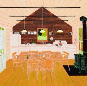 Beth Meadows creates mixed media drawings and paintings on wood that mix her life in East Tennessee with an aspirational life inspired by contemporary fashion, graphic, architectural, and interior design. Her style is modern meets folk art, where things are drawn in a flat, cartoon-like way.