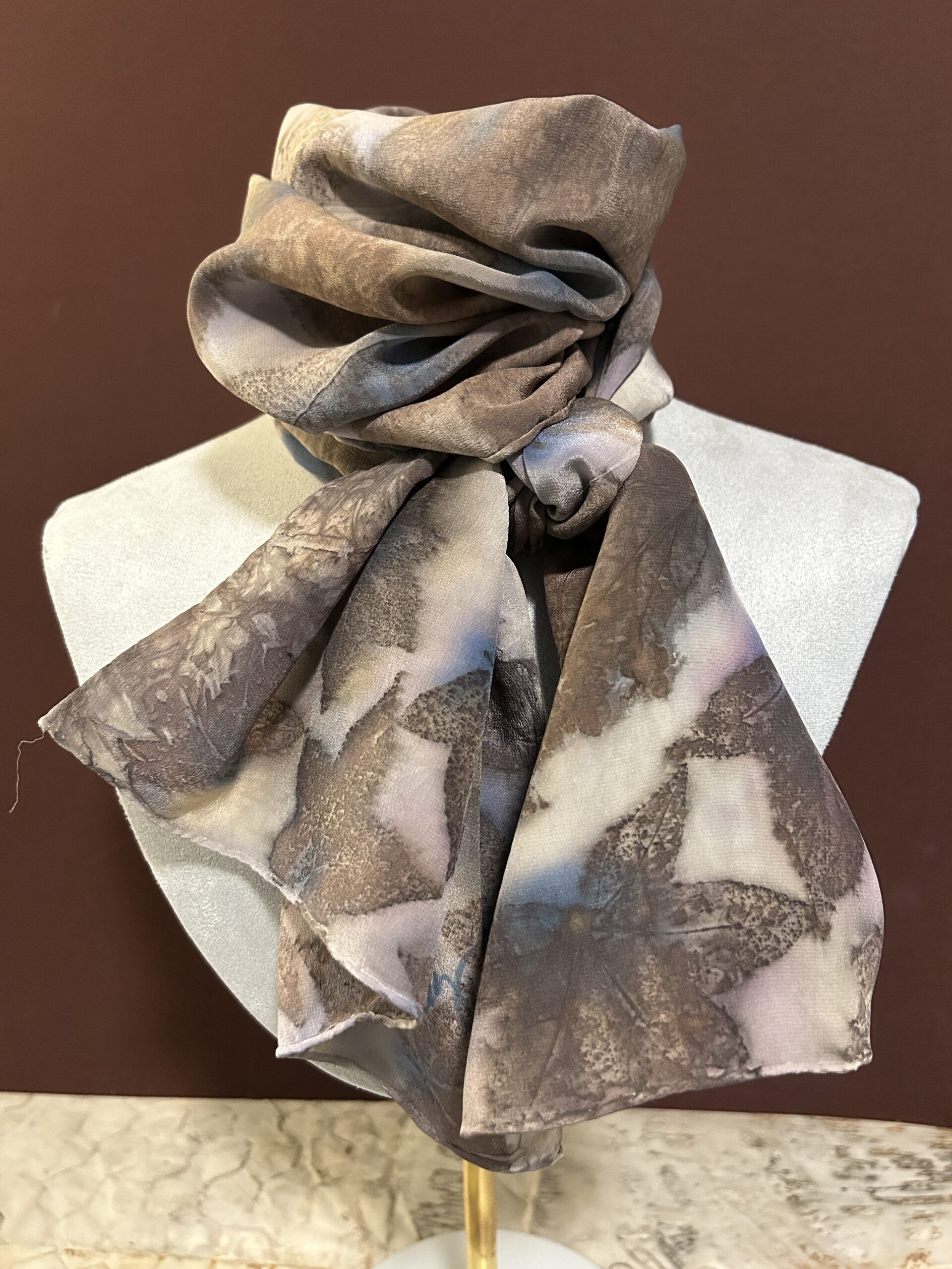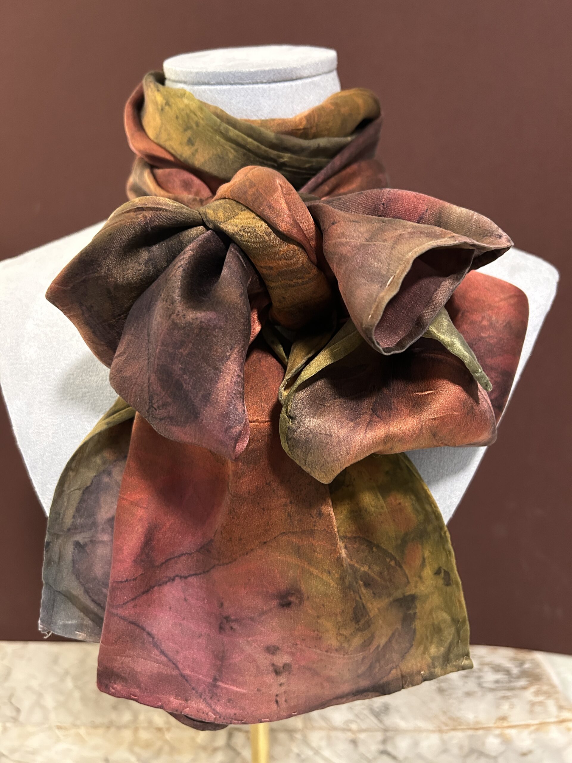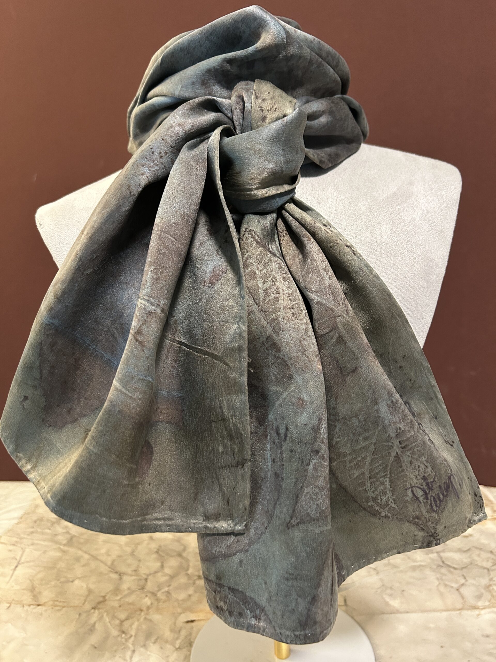 As a fiber artist, my work centers around the arts of eco printing, hand dyeing, and silk painting to craft exquisite art pieces, textiles, and home decor. My primary focus lies in utilizing hand dyeing and eco printing techniques, employing leaves to imprint on natural fibers such as paper, silk, cotton, and paper. Through the process of pressing these leaves between layers of fiber and treating them in a heated dye bath, the tannins are released, creating intricate prints on the fibers. My collection features luxurious, eco-printed silk scarves, garments, and vintage linens, alongside fine art prints that bring unique beauty to your home.