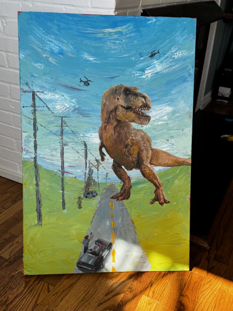 Ella Nelson is a contemporary artist specializing in acrylic painting. Her work is defined by bold color, playful imagery, and a touch of childlike whimsy that invites viewers to reconnect with their sense of wonder. Whether she’s painting dinosaurs with personality or dreamy, abstract landscapes, Ella’s art balances fun and feeling in a way that speaks to both casual art lovers and serious collectors. Based in Clinton, Tennessee, Ella runs Sip ‘n Graze Studio — a farm-based art space offering relaxed, beginner-friendly painting classes for all ages. As an instructor, she’s passionate about helping others tap into their creativity, regardless of experience. Her classes are lighthearted, welcoming, and designed to help students find joy in the process of making art.