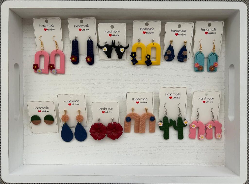 My 8 year old daughter Regan makes handmade polymer clay earrings. She may be young, but they are pretty freaking awesome. She decides on the style and colors, rolls out and shapes polymer clay, uses clay cutters, adds 3D adornments, bakes the clay in the oven to set, and then adds the nickel free hardware.